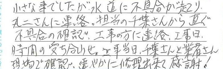 担当の千葉さんから直ぐ不具合の確認で工事の方に連絡、工事日・時間の打ち合わせ、工事当日、千葉さんと業者さん現場で確認、速やかに修理出来て感謝!