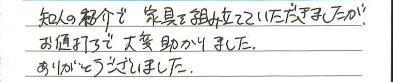 知人の紹介で家具を組み立てていただきましたがお値打ちで大変助かりました。