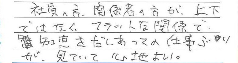 社員の方関係者の方が上下ではなく、フラットな関係で知恵をだしあっての仕事ぶりが見ていて心地良い。