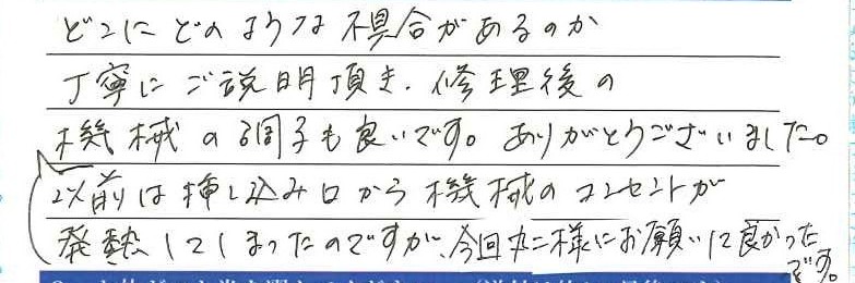 どこにどのような不具合があるのか丁寧にご説明頂き、修理後の機械の調子も良いです。