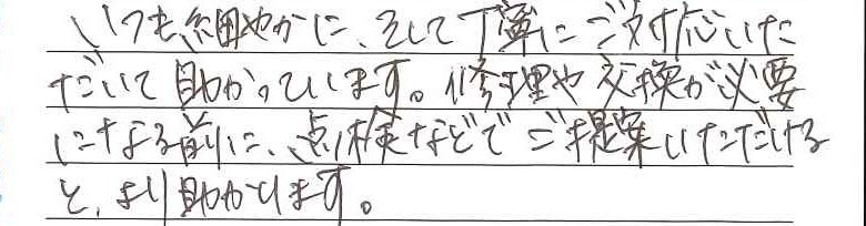 修理や交換が必要になる前に点検などでご提案いただけるとより助かります。