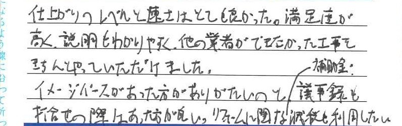 満足度が高く、説明もわかりやすく、他の業者ができなかった工事をきちんとやっていただけました。