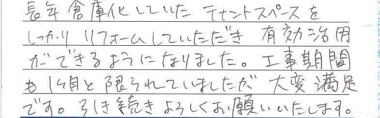 長年倉庫化していたテナントスペースをしっかりリフォームしていただき有効活用ができるようになりました。