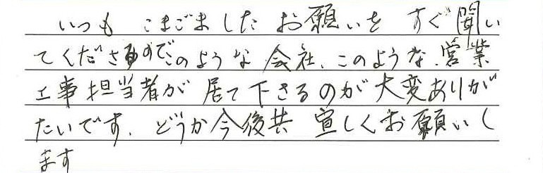いつもこまごましたお願いをすぐ聞いて下さるのでこのような会社、このような営業工事担当者がいて下さるのが大変ありがたいです。