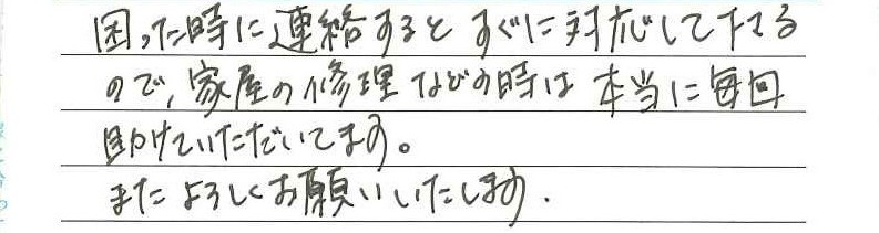 困った時に連絡するとすぐに対応して下さるので家屋の修理などの時は本当に毎回助けていただいてます。