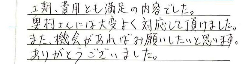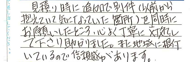 見積り時に追加で別件(以前から抱えていて気になっていた箇所)を同時にお願いしたところ、快く丁寧に対処して下さり助かりました。