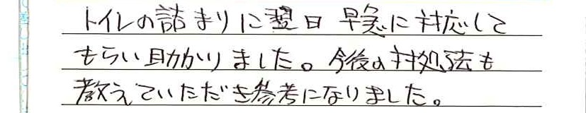 トイレの詰まりに翌日早急に対応してもらい助かりました。