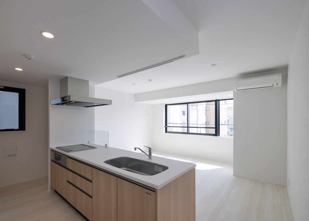 落ち着いたコンクリート打放しと深いネイビーが印象的で、街並みに静かに馴染む佇まいの賃貸併用住宅です。 端正な外観と住まい手に寄り添ったプランニングが、長く愛される建物の空気感をつくり出しています。 室内は採光・動線・使い勝手にこだわった設計を、施工の面から丁寧に形にしました。 可動間仕切りや回遊性のある水まわり、明るさを活かす窓配置など、日々の暮らしが自然と心地よくなる空間となっています。 共用部は落ち着いたトーンでまとめ、住む方を穏やかに迎えるホテルライクな雰囲気に。 精度や安全性を重視した施工で、オーナー様と設計者の意図を大切に、誠実に作り上げた建物です。 地域の一員として、この場所で多くの方の暮らしに寄り添い、安心と心地よさを支える存在となることを願っています。